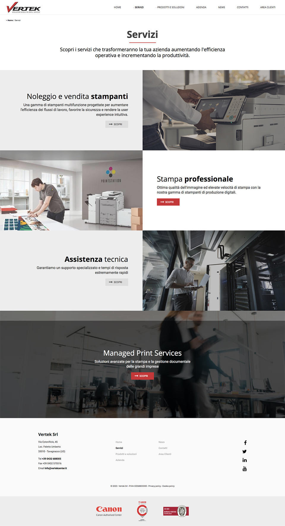 Da oltre 30 anni Vertek è Canon Business Center del Friuli Venezia Giulia, certificato nella consulenza e fornitura dell’intera gamma di soluzioni professionali Canon dedicate alla stampa e alla gestione documentale per il mercato business.