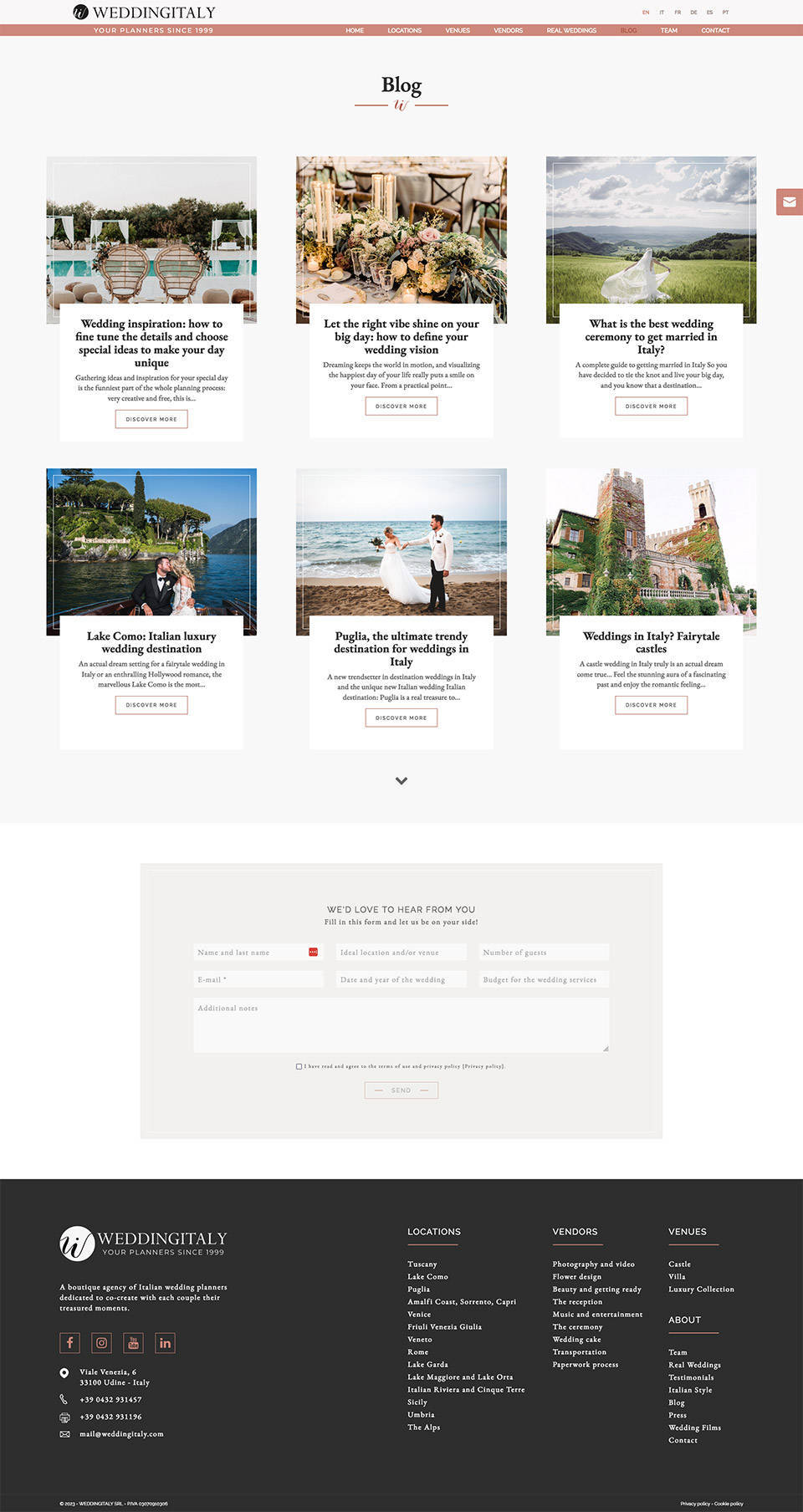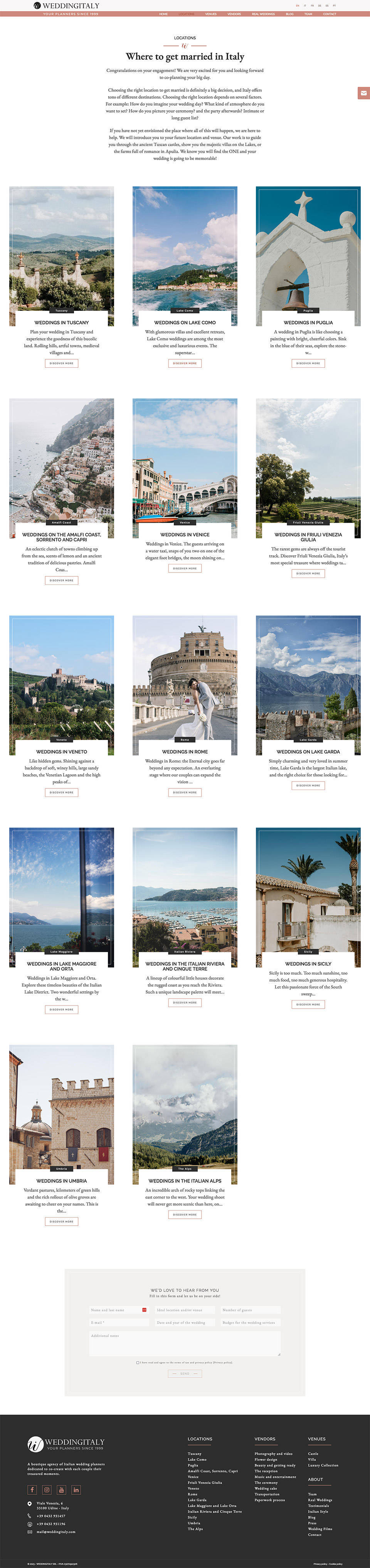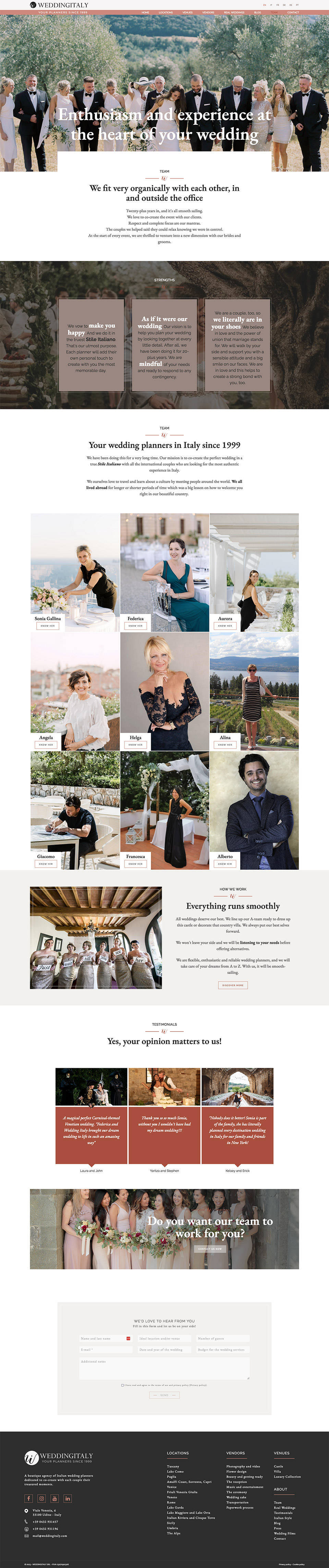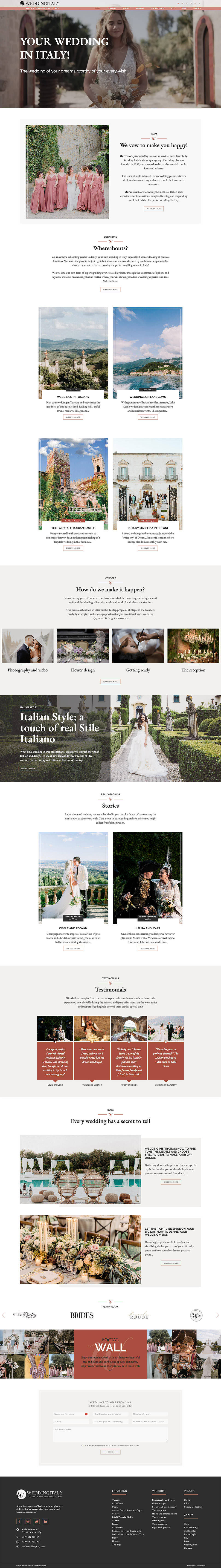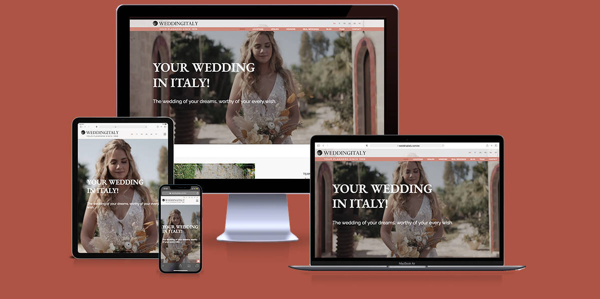 Il nuovo sito è stato realizzato in 6 lingue ed è completamente amministrabile per l'aggiornamento dei contenuti. La navigazione semplice e intuitiva, offre al visitatore una panoramica completa dei servizi offerti da Wedding Italy, valorizzando in particolare lo stile italiano.